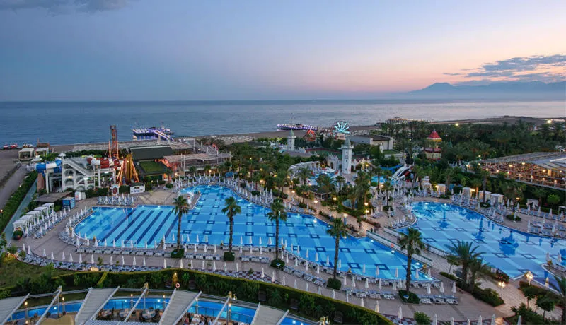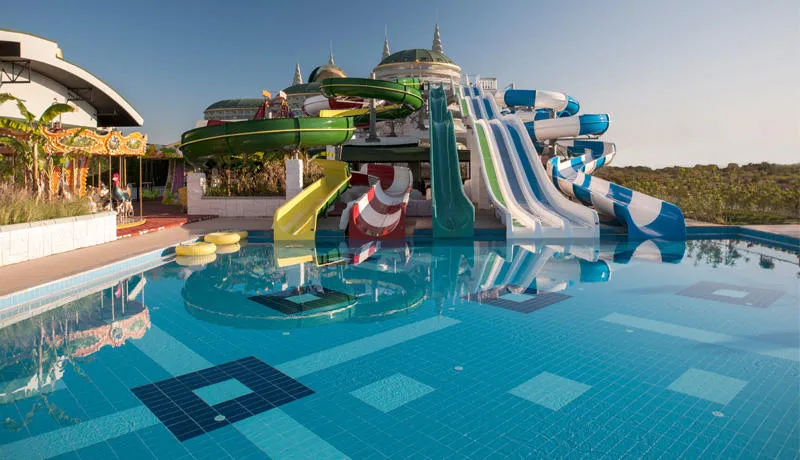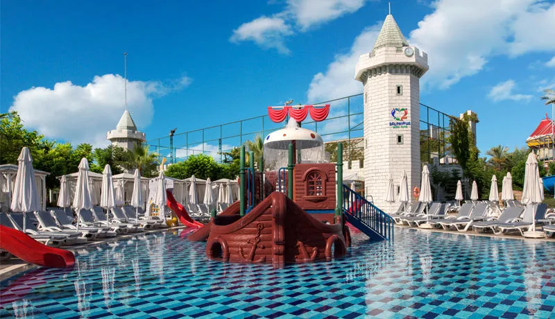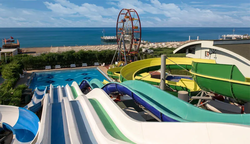 Gostima su na raspolaganju brojni sadržaji: 3 spoljašnja i 1 unutrašnji bazen, aqua park sa 5 tobogana, spa centar, teretana, bioskop, luna park, teniski i fudbalski tereni, kao i animacioni programi i dečiji klub za uzrast od 4 do 12 godina.