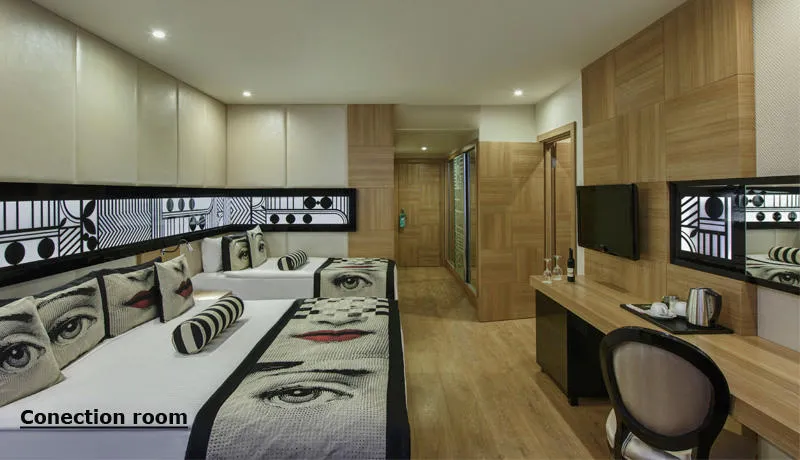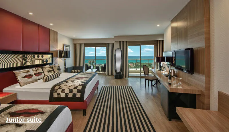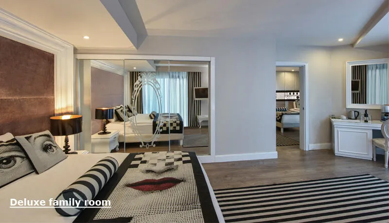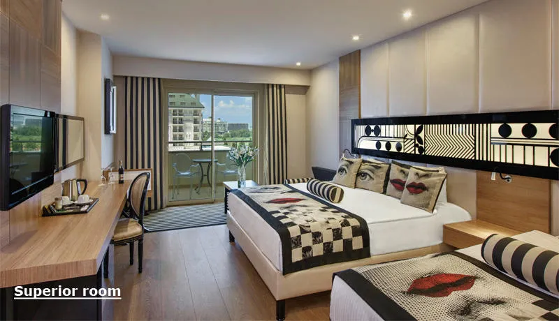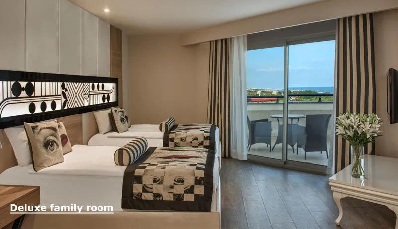 Gosti uživaju na prostranoj privatnoj peščanoj plaži, uz besplatne peškire, ležaljke i suncobrane. Hotel nudi 474 superior sobe, 64 junior suite sobe, 38 porodičnih i 21 Lagoon sobu sa direktnim izlazom na bazen – sve moderno opremljene i sa besplatnim Wi-Fi internetom, balkonom i mini barom.