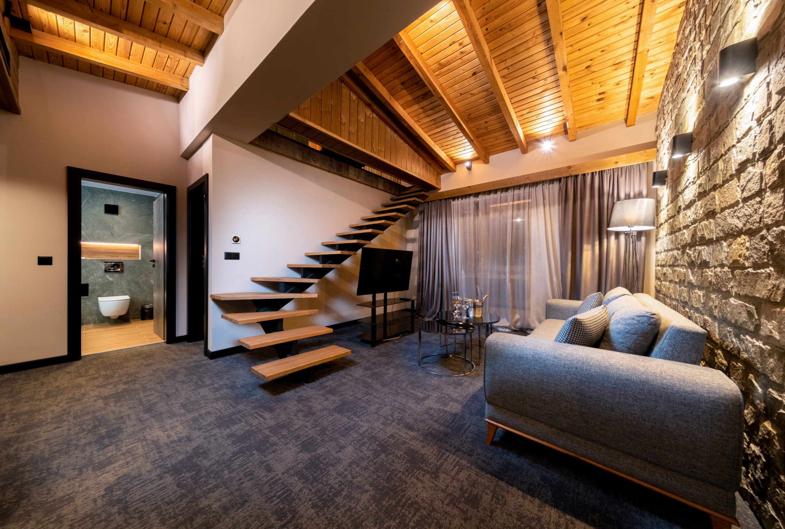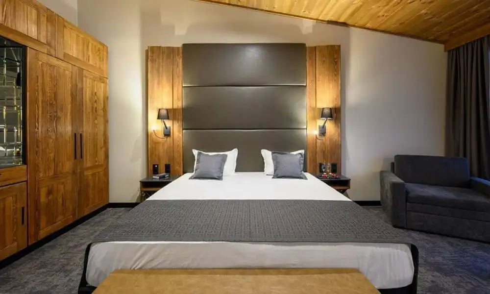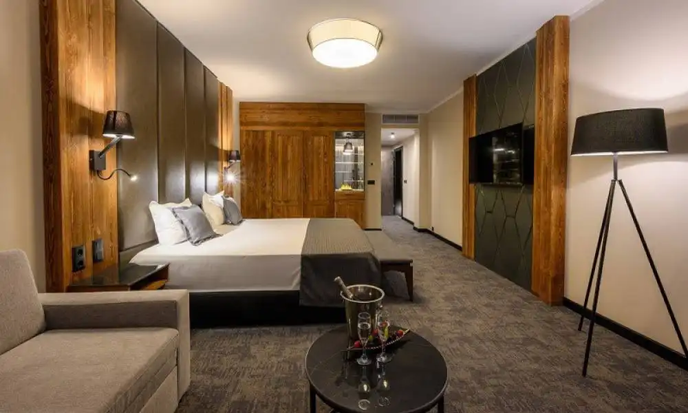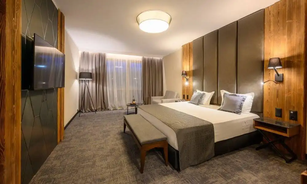 - Executive soba 2+1: 38 m2, komforna i luksuzno opremljena soba sa francuskim ležajem i foteljom, balkon sa pogledom na bazen i planinu Pirin. Mogu boraviti maksimalno dve odrasle osobe i jedno dete do 5.99 godina.