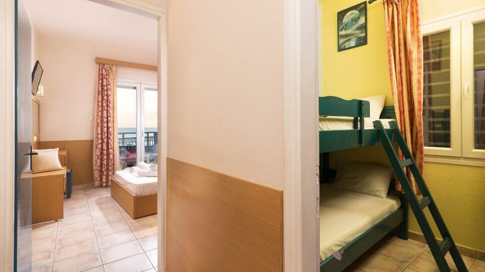 Family room bunk beds sea view – soba od 24m2, namenjena za 4 osobe, sadrži jedan bračni ili dva odvojena kreveta i jedan krevet na sprat.