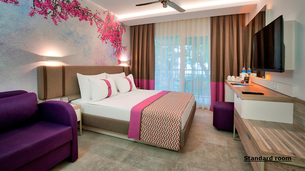 Gostima su na raspolaganju glavni restoran i tri a’la carte restorana (riblji, italijanski i turski – rezervacija uz doplatu), pet barova, besplatan Wi-Fi, tri spoljašnja bazena, dva vodena tobogana, teretana, sauna, parna soba, tursko kupatilo, aerobik, vaterpolo, teniski teren, košarka, pikado, odbojka na pesku, jedrenje na dasci (uz licencu), bicikli na vodi, kanu, stoni tenis i stoni fudbal. U ponudi su i noćna diskoteka, animacije za odrasle i decu, dečiji bazen, dečiji klub (4-12 godina), mini zoo, bioskop i igralište. Uz doplatu su dostupne dodatne usluge poput lekarskih pregleda, masaža, prodavnica, sportova na vodi i usluge pranja veša.